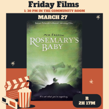 A young couple trying for a baby moves into an aging, ornate apartment building on Central Park West, NYC, where they find themselves surrounded by peculiar elderly neighbors. Rated R, run time 2h 17m. Airing at 1:30 PM in the Community Room on... more