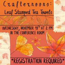 Join us on Wednesday, November 19th at 2 PM in the Conference Room for Crafternoons where participants will make fall-inspired leaf stamped tea towels! *REGISTRATION REQUIRED* Call (828) 586-2016 or email JCPL-Adults@fontanalib.org to register.