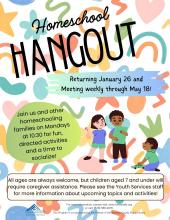 Returning January 26 and repeating weekly until May 18, we are pleased to present our Homeschool Hangout program! Join us Mondays at 10:30 for friendship, learning activities, and fun!