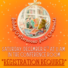 Our Book Ornaments craft class is back by popular demand! Make a keepsake ornament featuring ten of your favorite book covers on Saturday, December 6th at 11 AM in the Conference Room.  *REGISTRATION IS REQUIRED... more