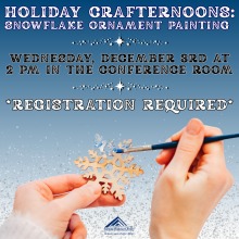 Join us on December 3rd at 2 PM in the Conference Room for Holiday Crafternoons! During this meeting we will be painting wooden snowflake ornaments. Each participant will be able to paint 2 ornaments a piece. *REGISTRATION REQUIRED* Call (828) 586-... more