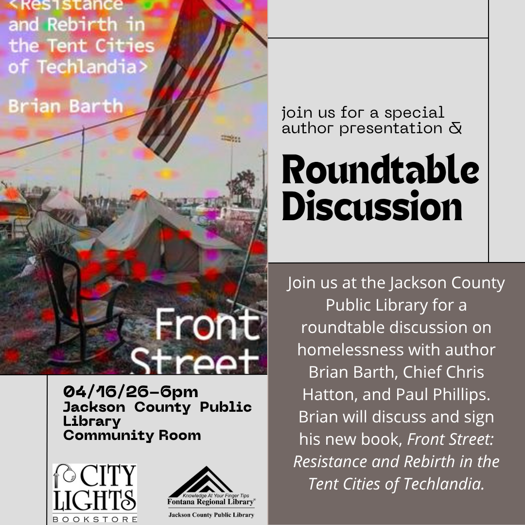 Join us for a roundtable discussion on homelessness with author Brian Barth, Sylva Police Chief Chris Hatton, & Paul Phillips, Interim Supervisor of HERE In Jackson County. Brian will discuss and sign his new book, Front Street: Resistance and Rebirth in the Tent Cities of Techlandia.