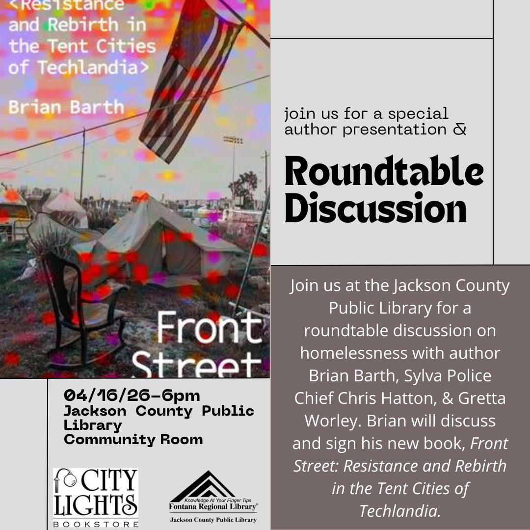 Join us at the Jackson County Public Library for a roundtable discussion on homelessness with author Brian Barth, Sylva Police Chief Chris Hatton, & Gretta Worley. Brian will discuss and sign his new book, Front Street: Resistance and Rebirth in the Tent Cities of Techlandia. This program will be in the Community Room library on Thursday, April 16th at 6pm.