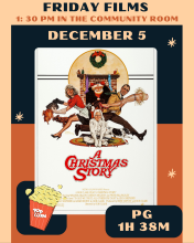 In the 1940s, a young boy named Ralphie Parker attempts to convince his parents, teacher, and Santa Claus that a Red Ryder Range 200 Shot BB gun really is the perfect Christmas gift. Run time 1h 38m, rated PG. Airing at 1:30 PM in the Community Room.
