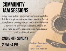 Bring your guitar, banjo, harmonica, mandolin, fiddle or rhythm instrument and join the fun at an informal jam session at the public library in Cashiers! All skill levels welcome. Piano on site. Folk, country, acoustic rock, Americana and... more
