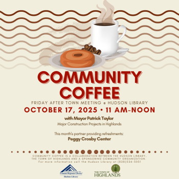 One Friday a month from March-October at 11:00 AM, the library hosts a talk / Q&A with Highlands Mayor Pat Taylor. Each month a different local non-profit is invited to sponsor the event and provide refreshments. Community Coffee is a collaboration between the Town of Highlands and Hudson Library. October's topic will be 'Major Construction Projects in Highlands' and the sponsor will be the Peggy Crosby Center.
