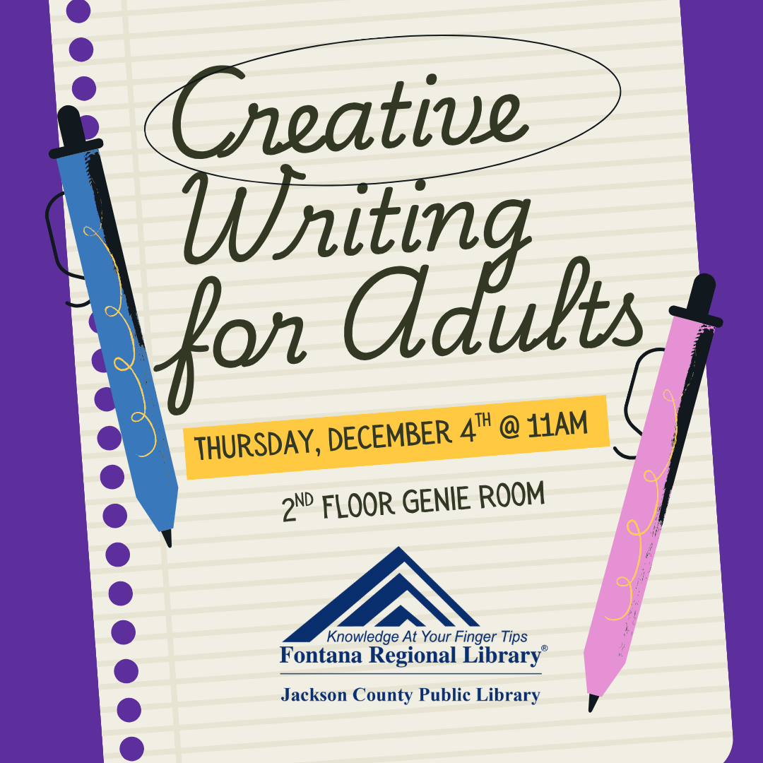 Join us at the Jackson County Public Library for a creative writing workshop for adults on Thursday, December 4th at 11am. The workshop is hosted by members of WCU’s Creative Writing Club and participants are encouraged to bring writing samples to share with the group and offer constructive feedback. This workshop is free and open to the public. For more information please call the library at 828-586-2016. The Jackson County Public Library is a member of the Fontana Regional Library.