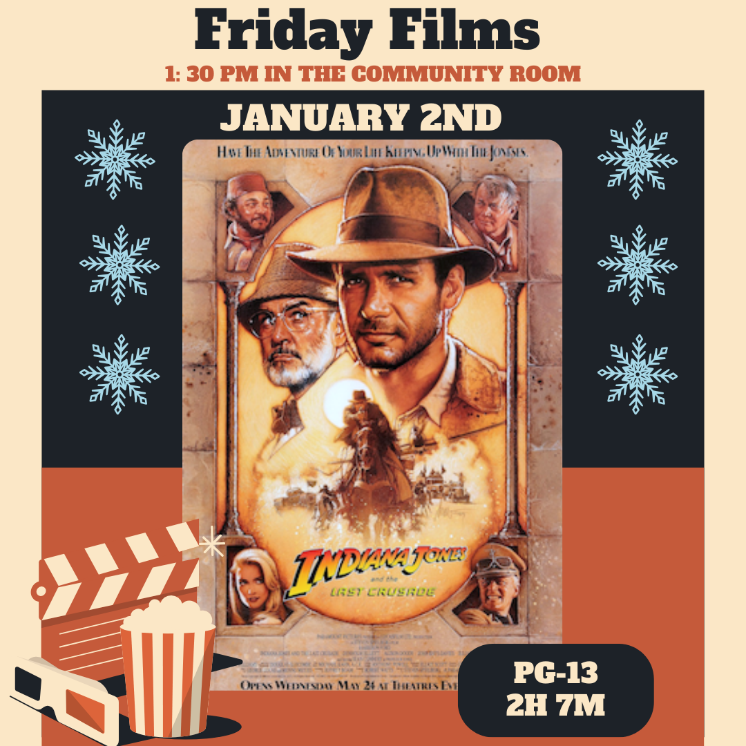 The intrepid explorer Indiana Jones sets out to rescue his father, a medievalist who has vanished while searching for the Holy Grail. Following clues in the old man's notebook, Indy arrives in Venice, where he enlists the help of a beautiful academic, but they are not the only ones who are on the trail, and some sinister old enemies soon come out of the woodwork. Rated PG-13, airing at 1:30 in the Community Room on January 2nd.