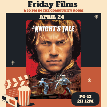 After his master dies, a peasant squire, fueled by his desire for food and glory, creates a new identity for himself as a knight. Run time 2h 12m, rated PG-13, airing at 1:30 PM on April 24th in the Community Room.