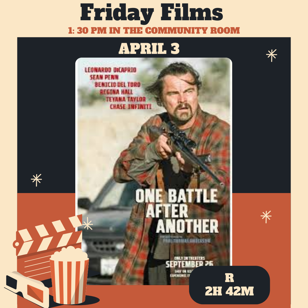 Bob is a washed-up revolutionary who lives in a state of stoned paranoia, surviving off-grid with his spirited and self-reliant daughter, Willa. When his evil nemesis resurfaces and Willa goes missing, the former radical scrambles to find her as both father and daughter battle the consequences of their pasts. Rated R, run time 2h 42m. Airing at 1:30 PM in the Community Room on April 3rd.