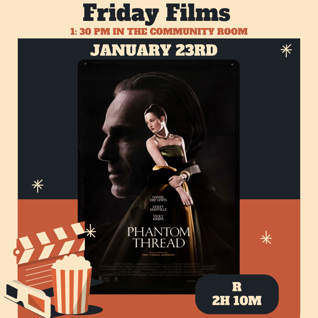 Renowned dressmaker Reynolds Woodcock and his sister Cyril are at the center of British fashion in 1950s London -- dressing royalty, movie stars, heiresses, socialites and debutantes. Women come and go in Woodcock's life, providing the confirmed bachelor with inspiration and companionship. His carefully tailored existence soon gets disrupted by Alma, a young and strong-willed woman who becomes his muse and lover. Rated R, run time 2h 10m, airing at 1:30 PM in the Community Room on January 23rd.