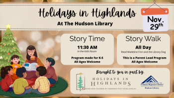 Join us at the Hudson Library for Holidays in Highlands, a collaboration with Highlands Chamber of Commerce, as we host a very special storyteller to spin winter stories for everyone to enjoy! Programs made for children K-5, but all ages welcome.