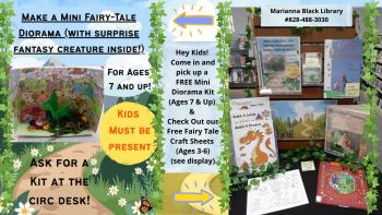 Come pick up a FREE Mini-Diorama Kit (Ages 7 & up). Kits supplies are enclosed in a stapled pouch so you'll be surprised by what you get! Enjoy a cardstock fanasty scene diorama sheet (to color, cut, and fold), a ziploc baggy full of decorating bits to glue on, and a story worksheet with questions (to imagine a character story for the mini-fantasy creature included). Combines elements of STEM, arts and crafts, and storytelling challenges for children ages 7 and up. (Also, check out our Free Fairy Tale Craft Sheets (Ages 3-6) on display). Families coming into the Library for this Free Kit, please be advised the child must be present to pick up the take home kit. Just come to the Circulation Desk and write your name and age on the sign-up sheet to receive your FREE kit (with a Surprise Fantasy Mini Animal Toy inside). For any Questions, please call the Marianna Black Library at #828-488-3030. Limited # of Kits, so come pick one up while supplies last!