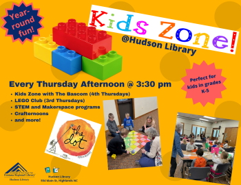 Every Thursday at 3:30, kids can enjoy a variety of fun and educational activities at the library! Kids Zone programs are free and open to the public. Programs are designed with kids in grades K-5 in mind.