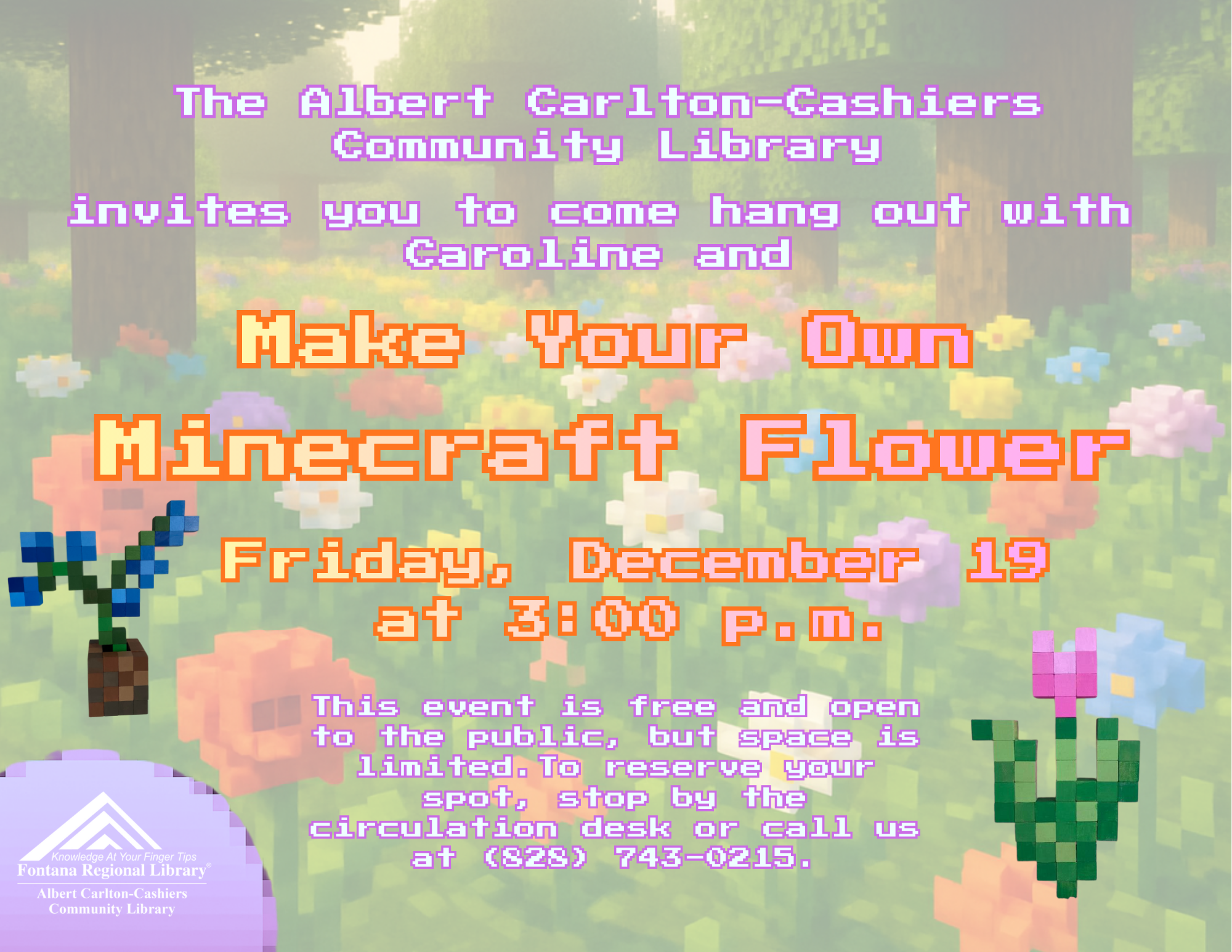 Join ACCCL staff member Caroline Morgan on Friday, December 19 at 3:00 p.m. for this fun and whimsical workshop! Using wood blocks, paint, and glue, Caroline will show you how to make your very own three-dimensional pixelated Minecraft flower. All ages are wlecome, and the library will provide all the materials you need to crerate your flower. This event is free and open to the public, but space and materials are limited, so reservations are encouraged. To reserve your spot, stop by the library's circulation desk or give us a call at (828) 743-0215.