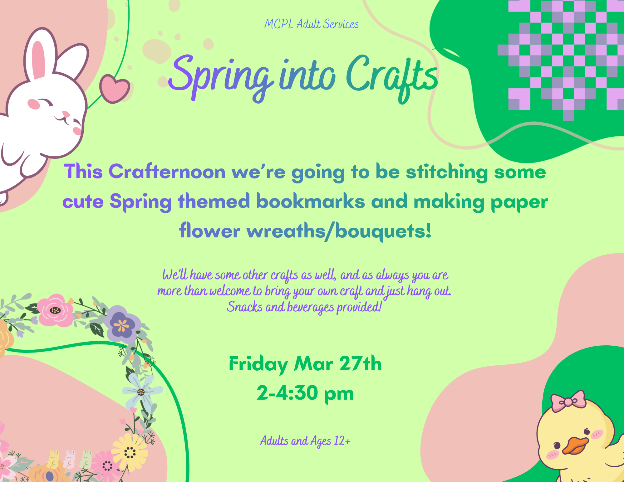 Come hang out with fun folks and make a spring themed bookmark or other craft! Or if you just want to hang around like-minded crafty folks to chat, you can bring your own craft from home too! Ages 12+ and adults, snacks provided
