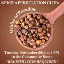 Join us at the Jackson County Public Library for our final Spice Club meeting on Tuesday, November 25th at 6 p.m. The group will meet in the Community Room and will feature Grains of Paradise. Spice Appreciation Club is a monthly program that gives... more