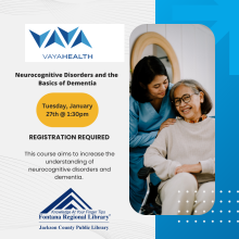 The Jackson County Public Library will host the next VAYA Health meeting on Tuesday, January 27th at 1:30pm. This course aims to increase the understanding of neurocognitive disorders and dementia. The curricula will examine the four most diagnosed... more