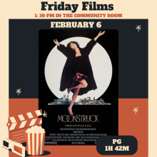 Loretta Castorini, a bookkeeper from Brooklyn, New York, finds herself in a difficult situation when she falls for the brother of the man she has agreed to marry. Rated PG, run time 1h 42m. Airing at 1:30 PM February 6th in the Community Room.