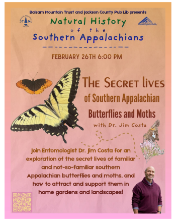 The Jackson County Public Library and The Balsam Mountain Trust have partnered for a series of talks on various topics on Southern Appalachian nature. The next talk will be 'The Secret Lives of Southern Appalachian Butterflies and Moths' on Thursday, February 26th at 6pm in the Community Room of the library.