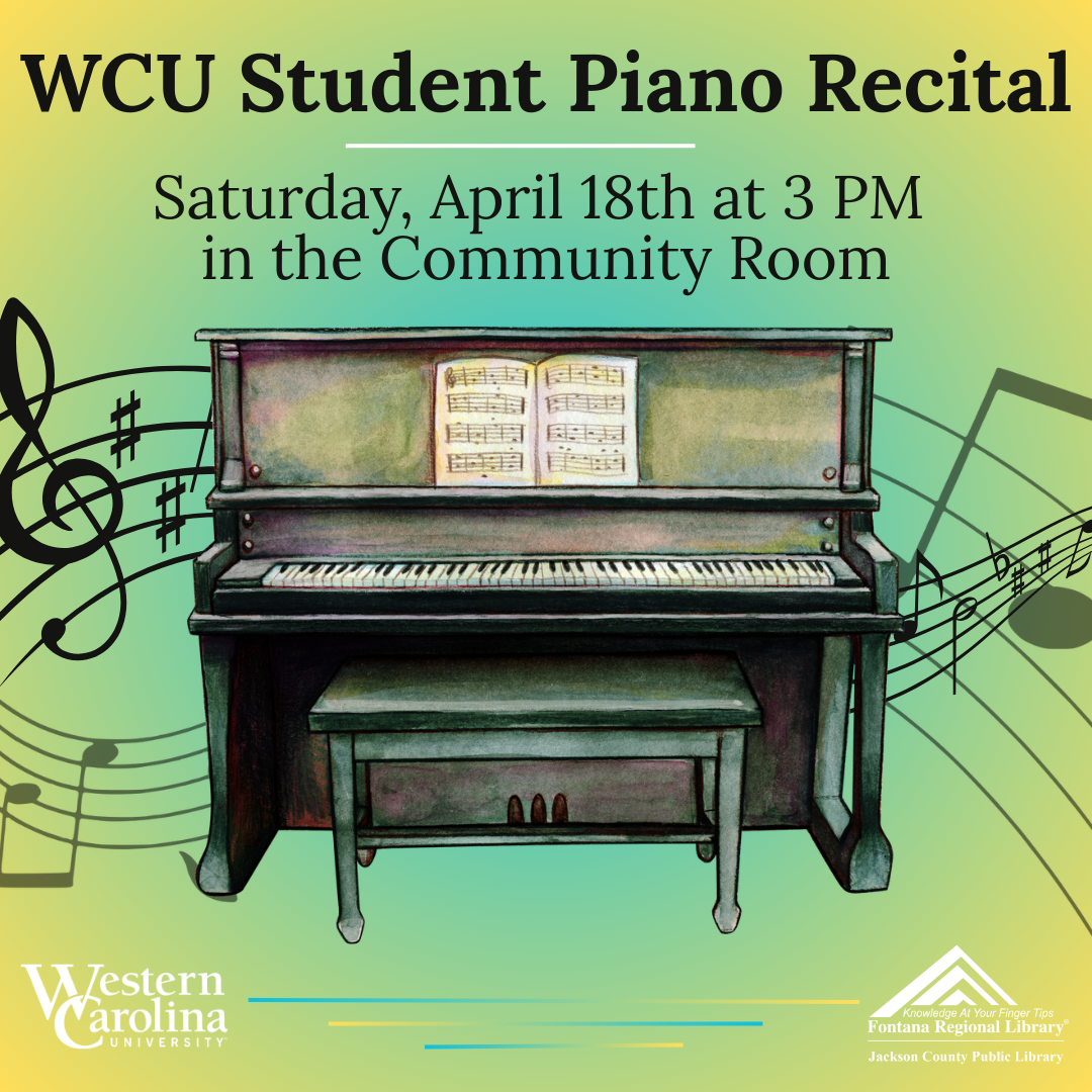 The Piano Department of the Western Carolina University School of Music brings their annual Spring recital to the Jackson County Public Library on Saturday, April 18, at 3pm. The library's beautiful Community Room is one of the region's most beautiful venues for live music.