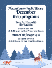 Ages 12-17, this is your space! Any and all are welcome! Play video games, board games, chat, make friends, create art, and more! Snacks are provided!!