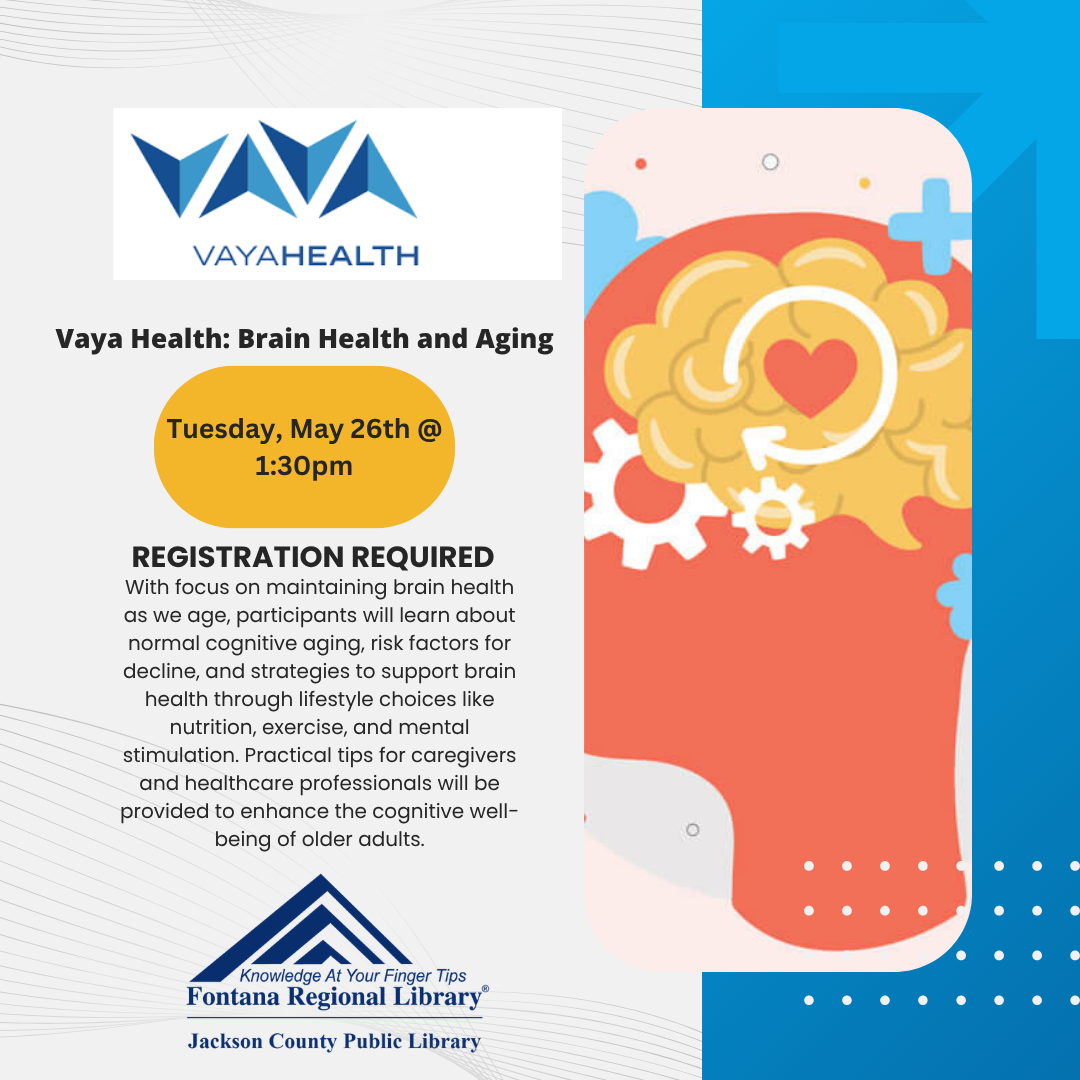 The Jackson County Public Library will host the next VAYA Health meeting on Tuesday, May 26th at 1:30pm. The meeting will be in the Conference Room. With focus on maintaining brain health as we age, participants will learn about normal cognitive aging, risk factors for decline, and strategies to support brain health through lifestyle choices like nutrition, exercise, and mental stimulation. Practical tips for caregivers and healthcare professionals will be provided to enhance the cognitive well-being of older adults. *Registration is required* To register please call the library at 828-586-2016 or email JCPL-Adults@fontanalib.org. The Jackson County Public Library is a member of the Fontana Regional Library.