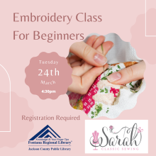 Join us at the Jackson County Public Library on Tuesday, March 24th at 4:30pm as Sarah Ward, of Sarah Classic Sewing, guides the class in learning beginner’s embroidery techniques. Sarah will teach the class how to embroider on a piece of fabric... more