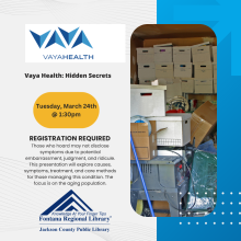 The Jackson County Public Library will host the next VAYA Health meeting on Tuesday, March 24th at 1:30pm. The meeting will be in the Conference Room. Have you ever had a secret you were too embarrassed to share? Those who hoard may not disclose... more