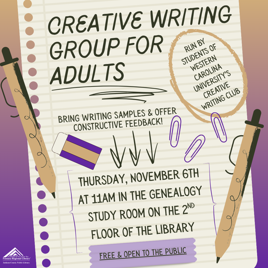 Join us at the Jackson County Public Library for a creative writing workshop for adults on Thursday, November 6th at 11am. The workshop is hosted by members of WCU’s Creative Writing Club and participants are encouraged to bring writing samples to share with the group and offer constructive feedback. This workshop is free and open to the public. For more information please call the library at 828-586-2016. The Jackson County Public Library is a member of the Fontana Regional Library.